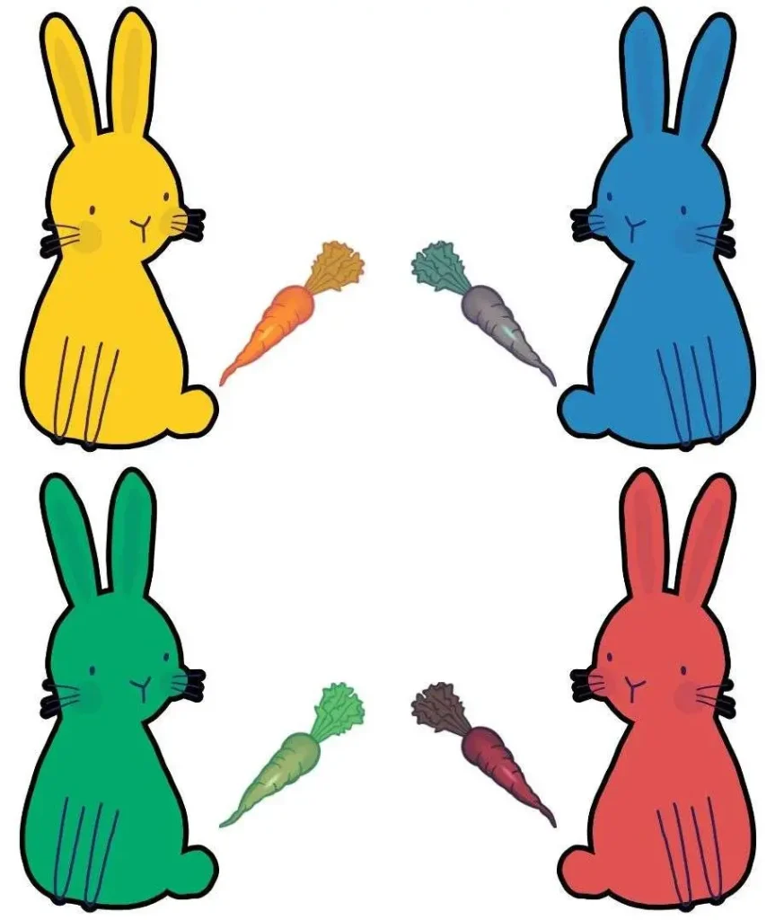 - Hint: Focus on the four possible carrot colours (green, blue, red, orange) to make the bunnies.